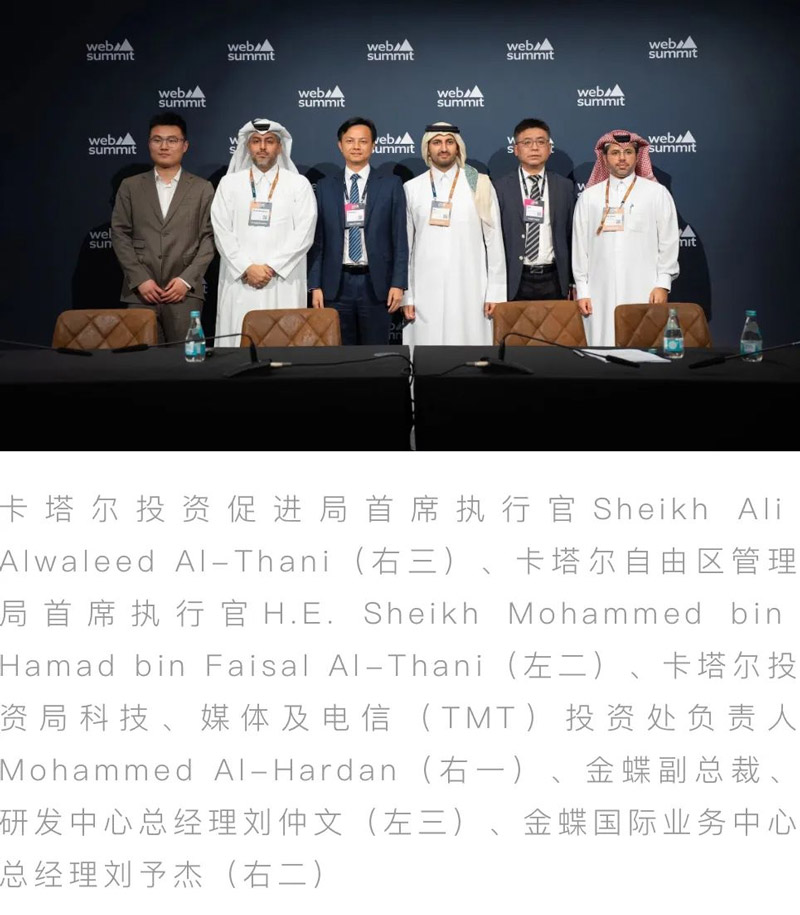 2023年12月,金蝶与QIA宣布达成一项协议,QIA将向金蝶投资约2亿美元。此次战略投资不仅体现了QIA对金蝶作为中国企业云转型领域的领军者和关键推动者的地位的认可,还契合其在全球数字化趋势下投资领先企业和技术的战略目标。金蝶集团董事会主席徐少春在2024年12月访问了卡塔尔,并决定以卡塔尔为桥头堡,拓展在中东和北非市场的业务,推动当地企业的数字化转型,助力卡塔尔实现“2030 年卡塔尔国家愿景”。“今天是金蝶全球扩张计划中的一个关键时刻。自2023年12月QIA投资以来,我们很高兴能通过在卡塔尔自由区开设中东地区的首家公司,进一步加强与卡塔尔的合作。我们很高兴能与QIA、卡塔尔投资促进局和QFZ合作,搭建起金蝶与中东市场沟通的桥梁,助力金蝶的国际增长战略。”