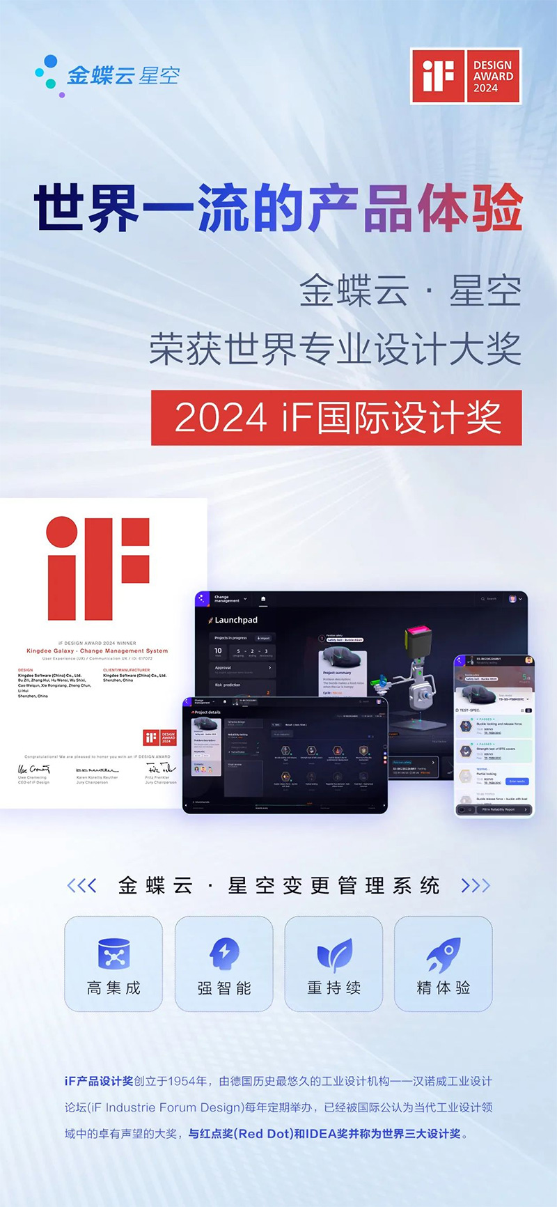 近日,德国汉诺威工业设计论坛公布了2024iF产品设计奖,金蝶云·星空凭借卓越的设计理念以及客户体验,斩获用户体验类-设计大奖。这是金蝶再次获得该奖项,金蝶获得国际设计权威机构的高度认可,标志着中国SaaS产品已具备国际一流的设计水准以及客户体验。