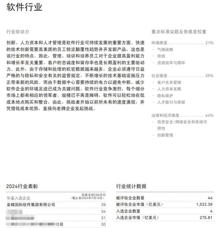 7月16日,标准普尔公司(以下简称"标普")发布了《可持续发展年鉴(中国版)2024》(以下简称"《年鉴》")。金蝶连续两年入选《年鉴》,并在ESG评分中蝉联中国软件行业第一!