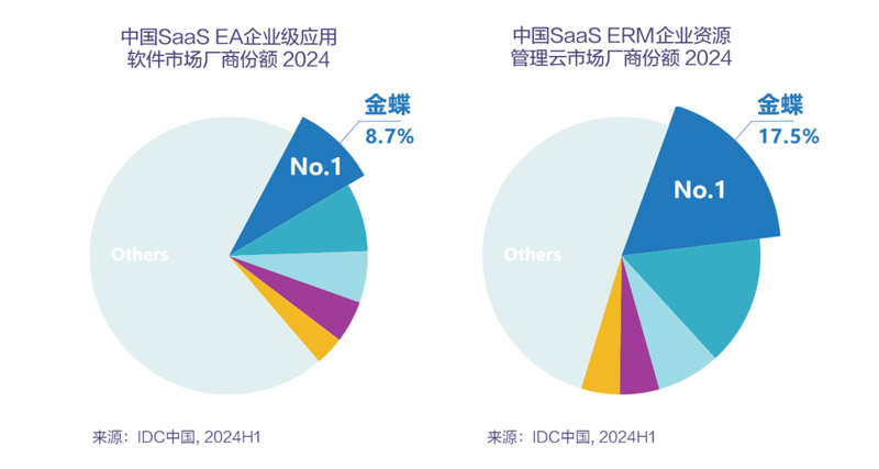 近日,国际数据公司IDC最新发布《2024H1中国企业级应用管理市场跟踪研究报告》(IDC PRC Semiannual Enterprise Application (EA) Tracker, 2024H1),数据显示,金蝶在SaaS EA(企业级应用软件云服务)、SaaS ERM(企业资源管理云服务,即云ERP)市场占有率均排名第一!